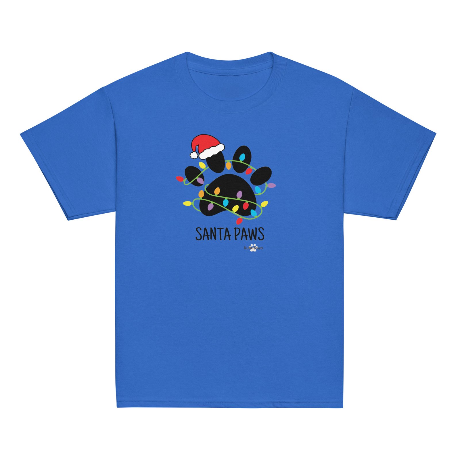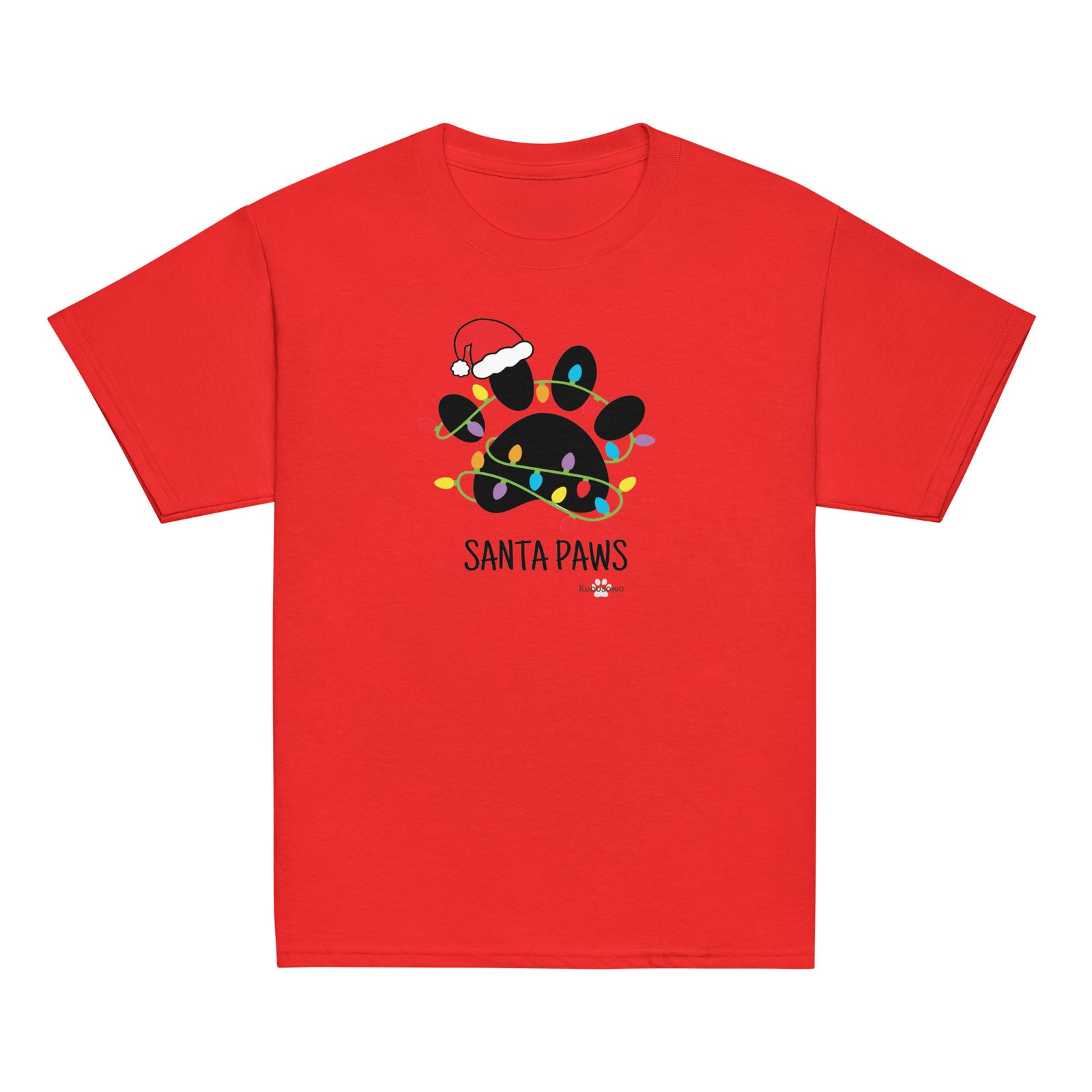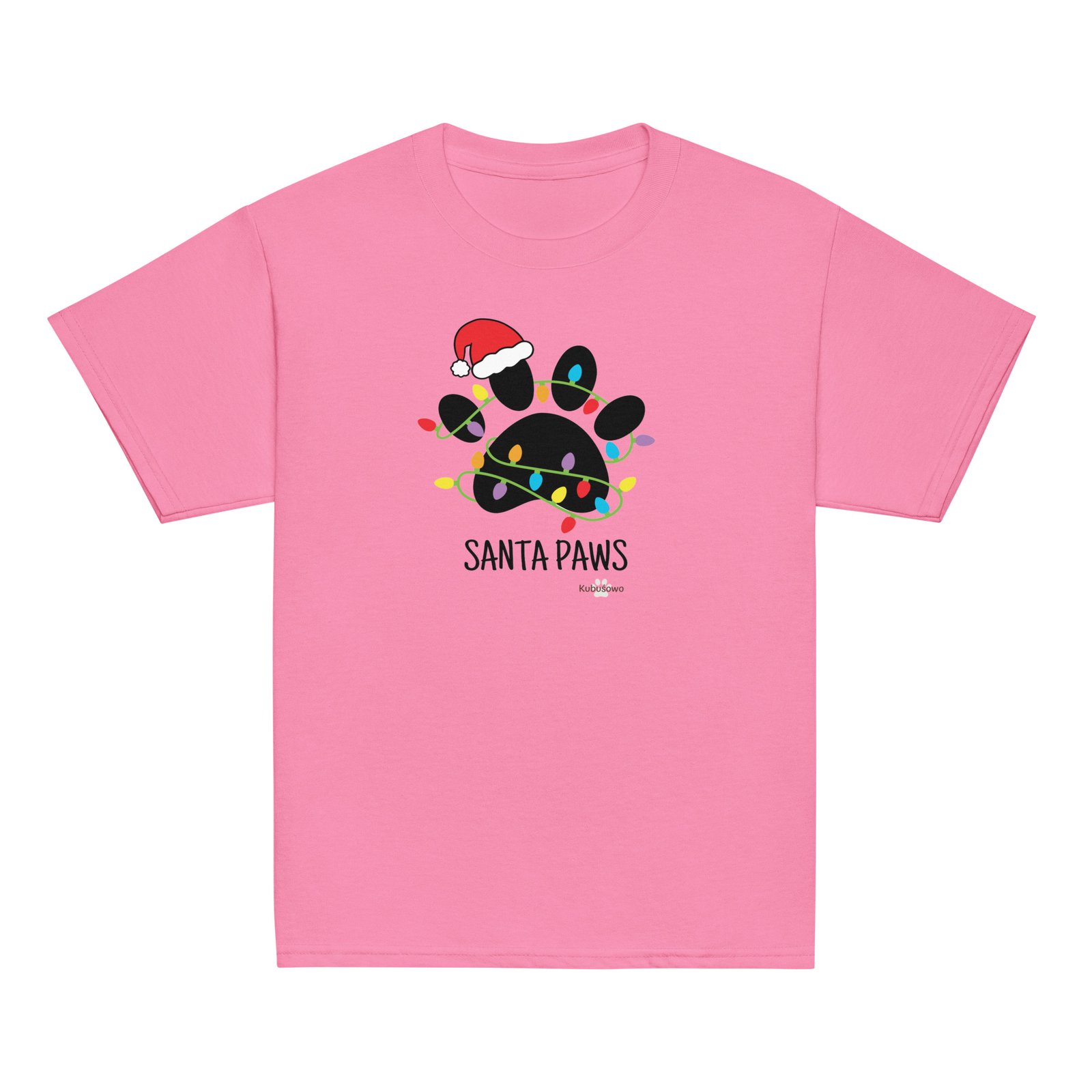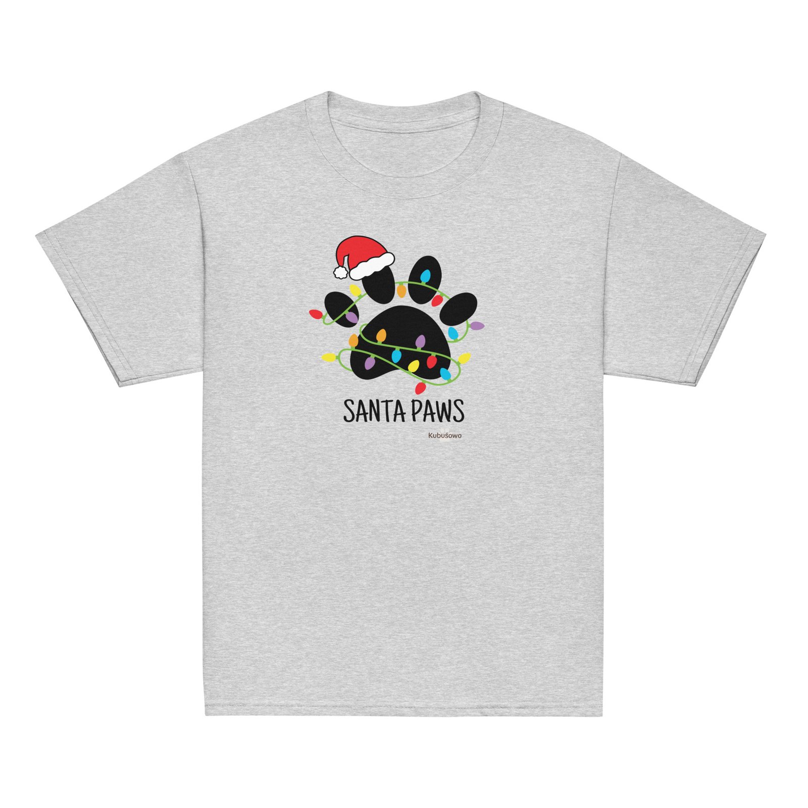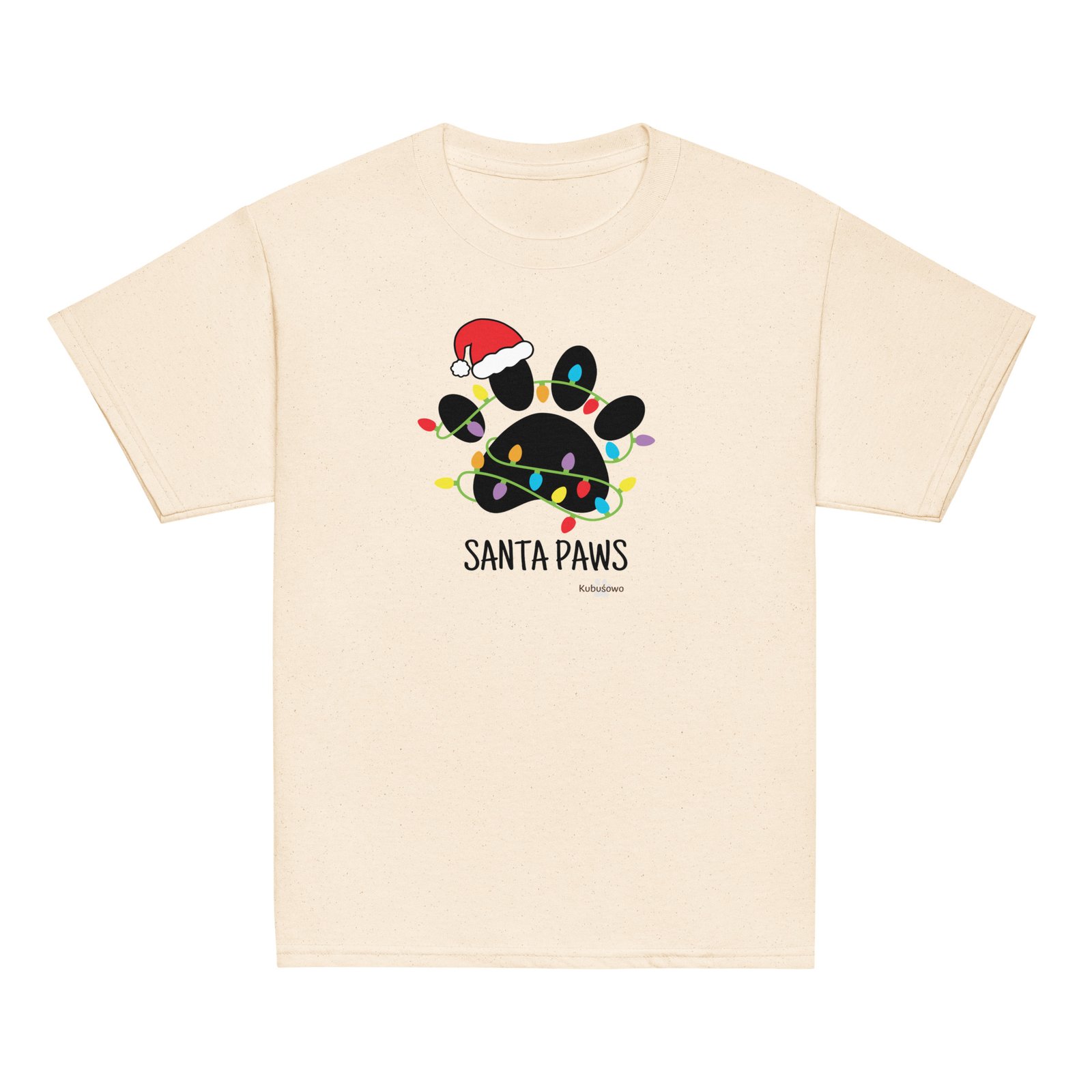 Na koszulce znajduje się odcisk łapki w czapce Mikołaja, owinięty kolorowymi lampkami choinkowymi. To wesoły i słodki wzór dla każdego fana piesków!